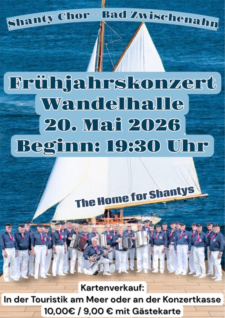 Auftrittstermine 2026in der WandelhalleMittwoch, 20. Mai 2026 „Frühjahrskonzert“Beginn 19.30 Uhr, Einlass ab 18.00 UhrMittwoch, 15. Juli 2026 „Sommerkonzert“Beginn 19.30 Uhr, Einlass ab 18.00 UhrMittwoch, 9. Sept. 2026 „Herbstkonzert“Beginn 19.30 Uhr, Einlass ab 18.00 UhrSonntag, 13. Dez. 2026 „Weihnachtskonzert“Beginn 15.00 Uhr, Einlass ab 14.00 UhrKartenvorkauf in der Touristik am Meer oder an der Konzertkasse 10,00 /9,00 € mit Gästekarte.