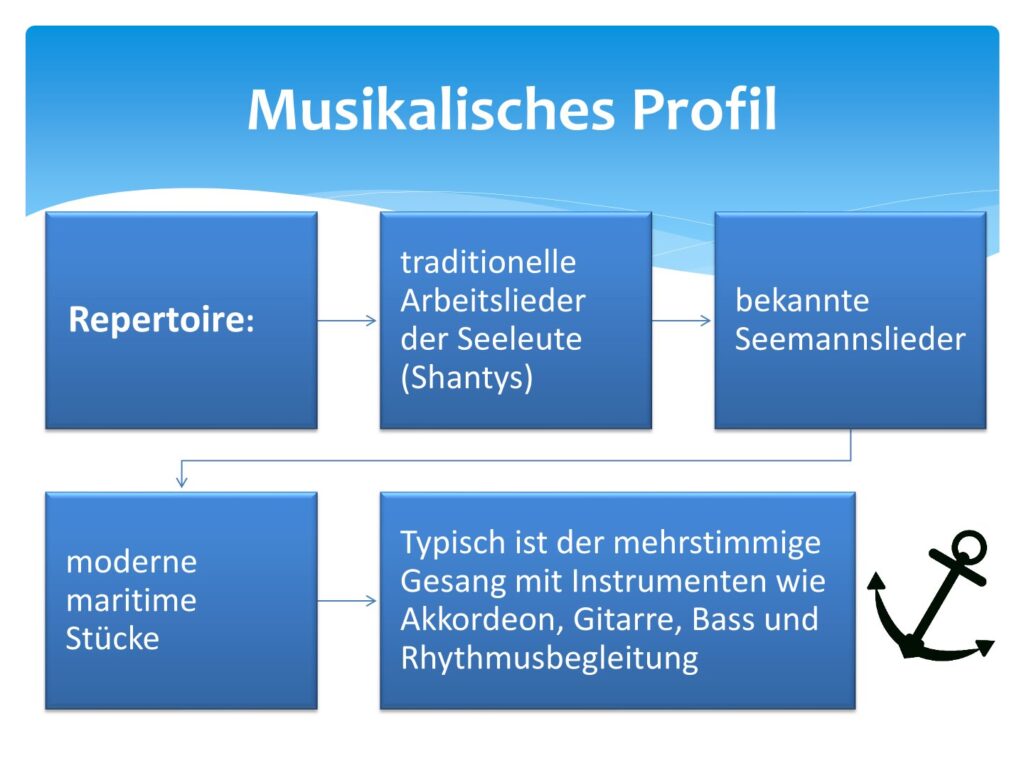 Das Repertoire unseres Chores umfasst traditionelle Shantys, bekannte Seemannslieder und moderne maritime Titel, begleitet von Akkordeons, Gitarren, Bass und Schlagzeug entsteht der typische, kraftvolle Shantychor-Sound, der jedes Publikum in seinen Bann zieht.